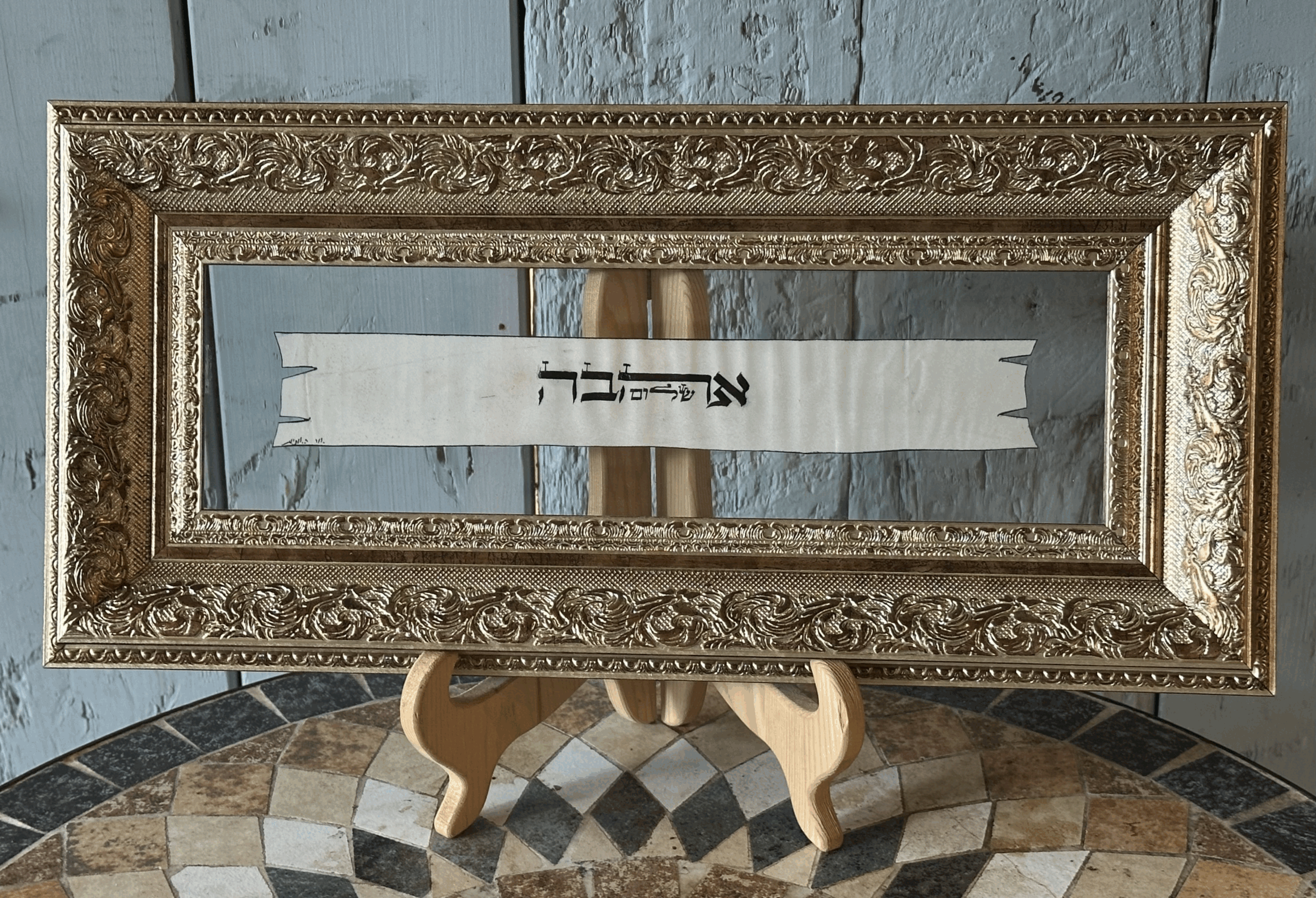 הכיתוב "אהבה, שלום" נכתב בעבודת יד על קלף אמיתי, בקו קליגרפי מדויק ואלגנטי. היצירה ממוסגרת במסגרת זהב מעוטרת ומרשימה, שמעניקה לה נוכחות ייחודית ותחושת יוקרה. העיצוב האורכי מדגיש את פשטות המילה ואת העוצמה הטמונה בה, והופך את היצירה לפריט מיוחד שימשוך את העין בכל חלל שבו יוצב