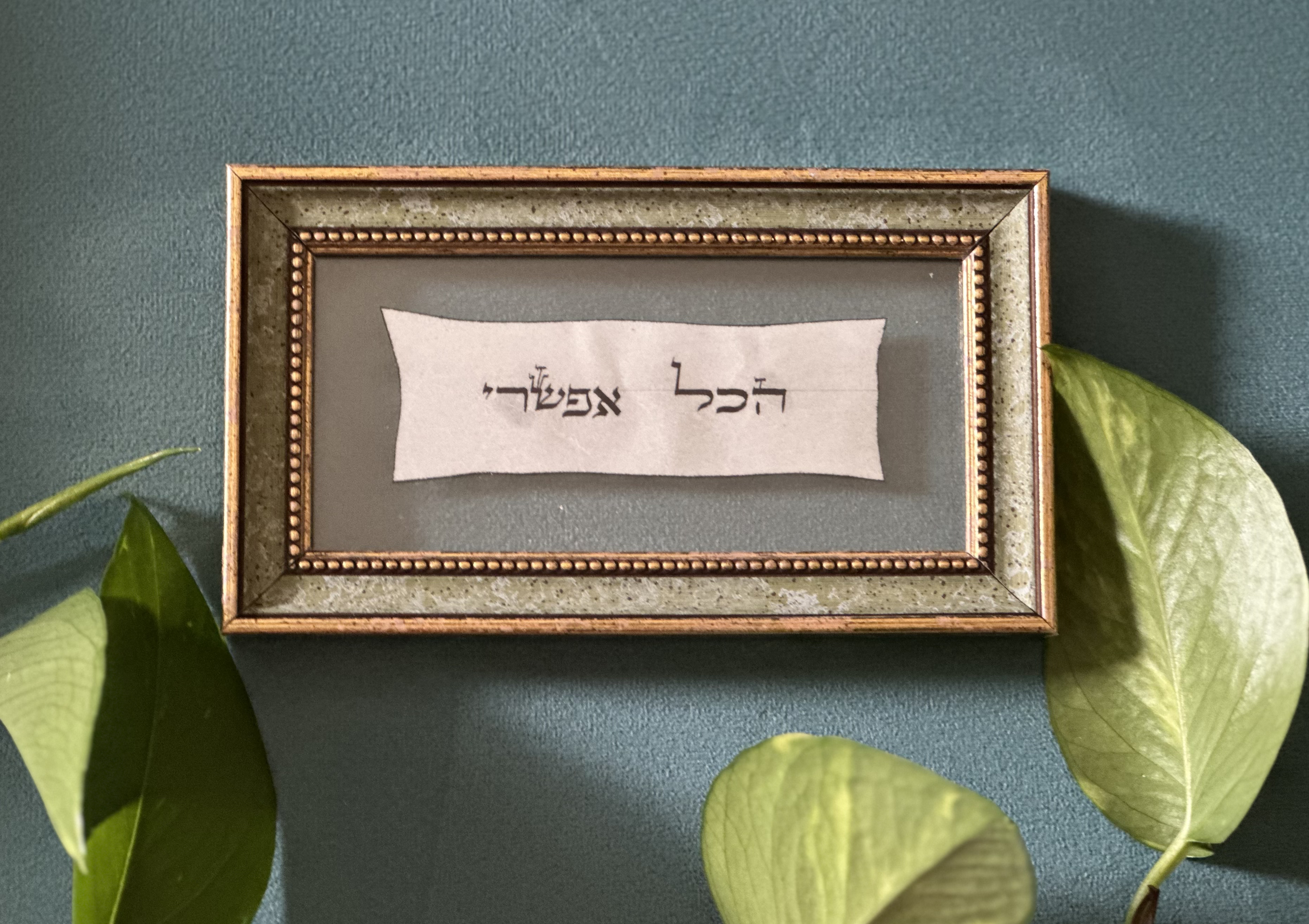 תמונה ייחודית עם הכיתוב "הכל אפשרי" בכתב יד על קלף אמיתי. ממוסגרת במסגרת מעוצבת בגוון ירקרק עדין, המעניקה מראה אלגנטי ומיוחד. פריט מושלם להוספת השראה וחיוביות לכל חלל. עבודת יד קלאסית שמשלבת אומנות מסורתית עם עיצוב מודרני. המוצר זמין גם בגדלים נוספים ובמסגרות מגוונות, ובמחירים שונים